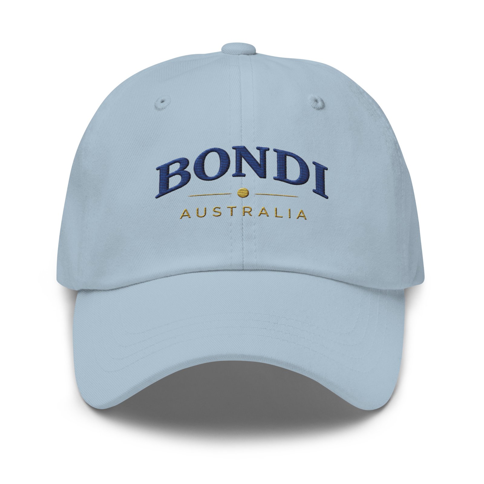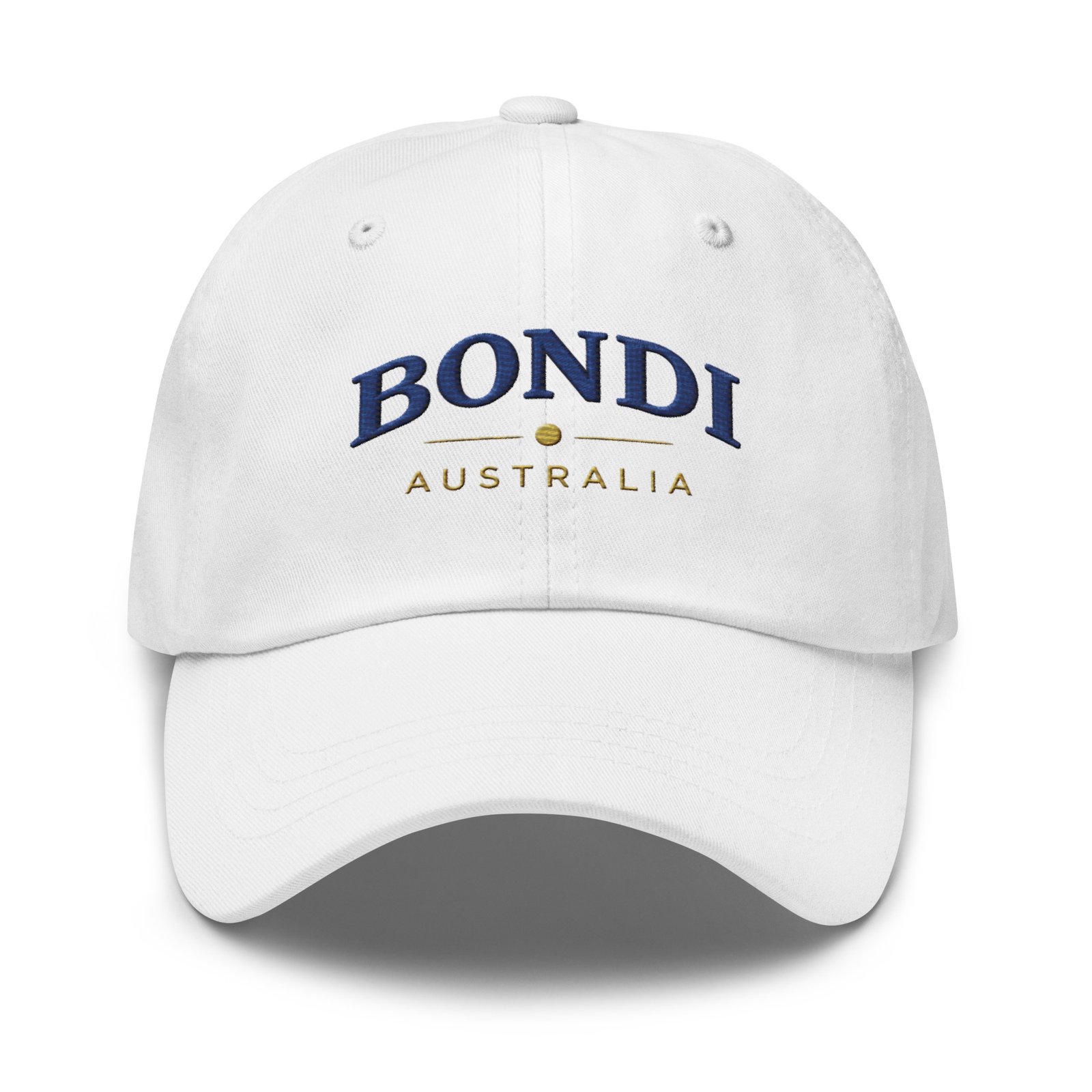 Bring relaxed coastal style wherever you go with this BONDI Australia embroidered dad hat. Inspired by the laid-back energy of Bondi Beach, this minimalist design pairs classic navy embroidery with warm gold accents for a timeless, premium look.